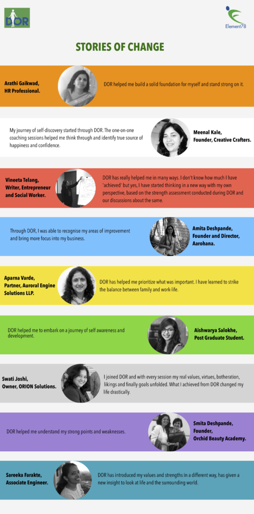 After many successful editions of DOR, this Navratri, we requested 9 participants from the earlier DOR sessions to share what they had gained out of these sessions. Reading what our participants felt about DOR and how it helped them was pure delight. Here is an infographic which summarises all these nine testimonials in a single one!